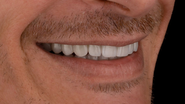 O plano de tratamento combinou implantes dentários para repor dentes ausentes com facetas em cerâmica de alta estética, desenhadas à medida para criar um sorriso natural, equilibrado e adaptado à expressão e estrutura facial do paciente.